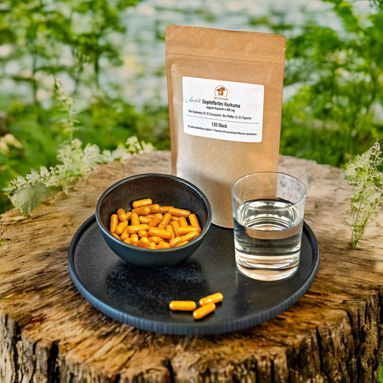 Zutaten: Bio Kurkuma (3-5% Curcumin), Bio Pfeffer (3-5% Piperin), Kapselhülle HPMC Hydroxypropylmethycellulose