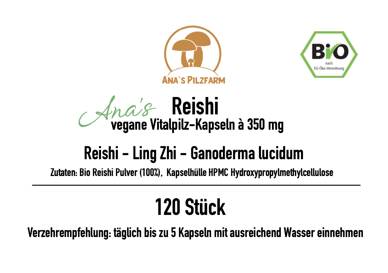 Zutaten: Bio-Reishi Pulver, Kapselhülle HPMC Hydroxypropylmethycellulose