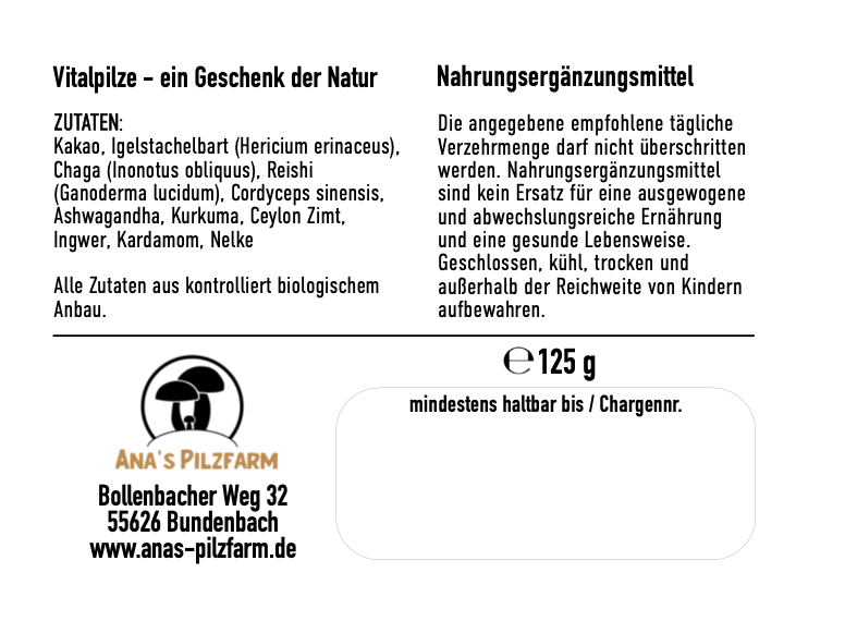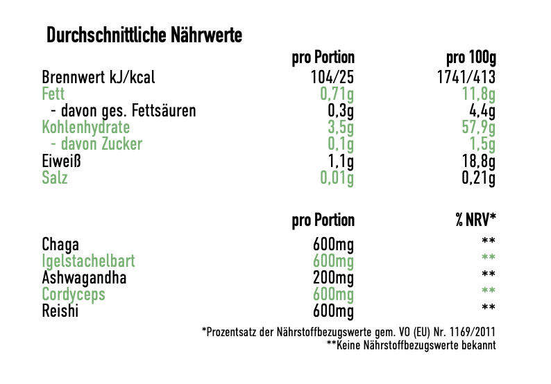 Die enthaltene Menge ist ausreichend für ca. einen Monat, wenn du dir jeden Tag eine Tasse gönnst.Zutaten: Kakao, Igelstachelbart (Hericium erinaceus), Chaga (Inonotus obliquus), Reishi (Ganoderma lucidum), Cordyceps sinensis, Ashwagandha, Kurkuma, Ceylon Zimt, Ingwer, Kardamom, Nelke
