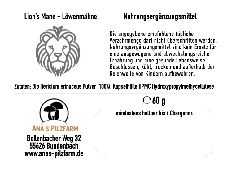 Verzehrempfehlung: 1-2 Mal pro Tag 1 TL (3g) in erwärmte vegane Milch einrührenLion’s Mane Kapseln vegan – hochwertiges Bio-Lion’s Mane (Hericium erinaceus), bekannt als „Igelstachelbart“, das dich bei mentaler Klarheit und Konzentration unterstützen kann. Ideal für deinen Alltag, Studium oder Beruf. Die enthaltene Menge Kapseln ist – je nachdem für welche Dosierung du dich entscheidest – ausreichend für 1-2 Monate täglicher Einnahme.